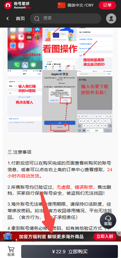 目录 搜索 展开 一、商品发货问题1.账号&卡密商品二、商品提取问题1.海外账号类如何提取?2.卡密类商品如何提取?3.APP应用下载类如何提取?三、商品质量问题1.账号类商品质量问题?2.卡密类商品质量问题?四、商品使用问题1.海外账号1.1推特账号使用问题?1.1.1推特账号常见FAQ1.1.2登录与封禁问题1.1.3推特2fa教程1.1.4推特登陆教程1.2Tg账号使用问题?1.2.1TG账号常见FAQ1.2.2登录与封禁问题1.2.3TG手机直登教程1.2.4TG电脑端登陆教程1.3苹果ID使用问题?1.3.1苹果ID常见FAQ1.3.2登录与封禁问题1.4TK账号使用问题?1.4.1TK账号常见FAQ1.4.2登录与封禁问题1.4.3TK登陆教程1.5ins账号使用问题?1.5.1ins账号常见FAQ1.5.2登录与封禁问题1.5.3双重验证教程1.6油管账号使用问题?1.6.1油管账号常见FAQ1.6.2登录与封禁问题1.6.3辅助邮箱使用教程1.7脸书账号使用问题?1.7.1脸书账号常见FAQ1.7.2登录与封禁问题1.7.3双重验证教程1.8奈飞账号使用问题?1.8.1奈飞账号常见FAQ1.8.2登录与封禁问题1.9谷歌账号使用问题?1.9.1谷歌账号常见FAQ1.9.2登录与封禁问题1.9.3更改谷歌辅助邮箱教程1.9.4谷歌提示手机验证解决教程1.9.5谷歌辅助邮箱使用方法2.海外点卡2.1苹果礼品卡2.2谷歌礼品卡2.3任天堂礼品卡2.4 Steam礼品卡2.5香港手机卡3.安装包下载3.1安装链接无法打开怎么办?3.2安装过程中提示有风险怎么办?3.3安装包安装的不是最新版本怎么办?3.4安装包可以安装苹果手机吗?4.系统应用类4.1Windows激活码激活提示错误怎么办?4.2Windows激活的版本不对怎么办?五、商品售后问题1.海外账号类商品2.海外点卡类商品3.应用下载类商品六、联系不上客服1.联系客服,提示要排队?2.添加微信客服,长时间不回消息?3.客服回复比较慢怎么办?七、accountboy账户问题1.账户为什么提示异常不能下单?2.为什么发货客服要我提供资料?八、商品批采说明1.如何批量采购2.批量采购后如何发货九、人工服务时间1.人工在线时间2.人工联系方式十、如何入粉丝群1.如何添加自己的专属福利官? 暂无相关搜索结果! 1.如何添加自己的专属福利官? 1.如何添加自己的专属福利官?①您可以在任意的商品购买页面,点击底部位置(如下图所示),将二维码进行保存,再使用微信扫码添加官方福利官②您可以直接扫下方二维码,添加自己的专属福利官作者:商城-帮助中心 创建时间:2024-12-04 11:40最后编辑:好开心 更新时间:2025-03-19 15:15