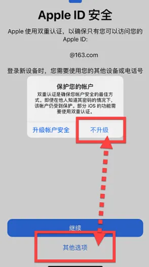 ● 解决办法:可以返回上一步,apple id安全页面选择“其他选项 ”,弹窗选择“ 不升级 ”。