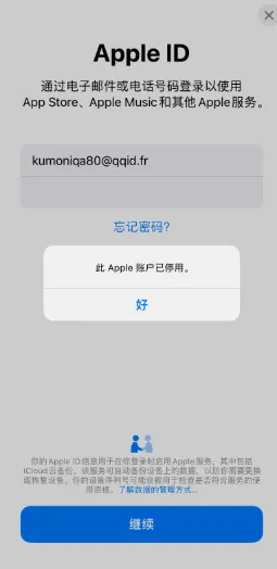 ●解决办法:①更换网络环境 ,或者设备重启试试,②可以登陆苹果官网查看是否有提示被停用哦,【官网链接】https://appleid.apple.com